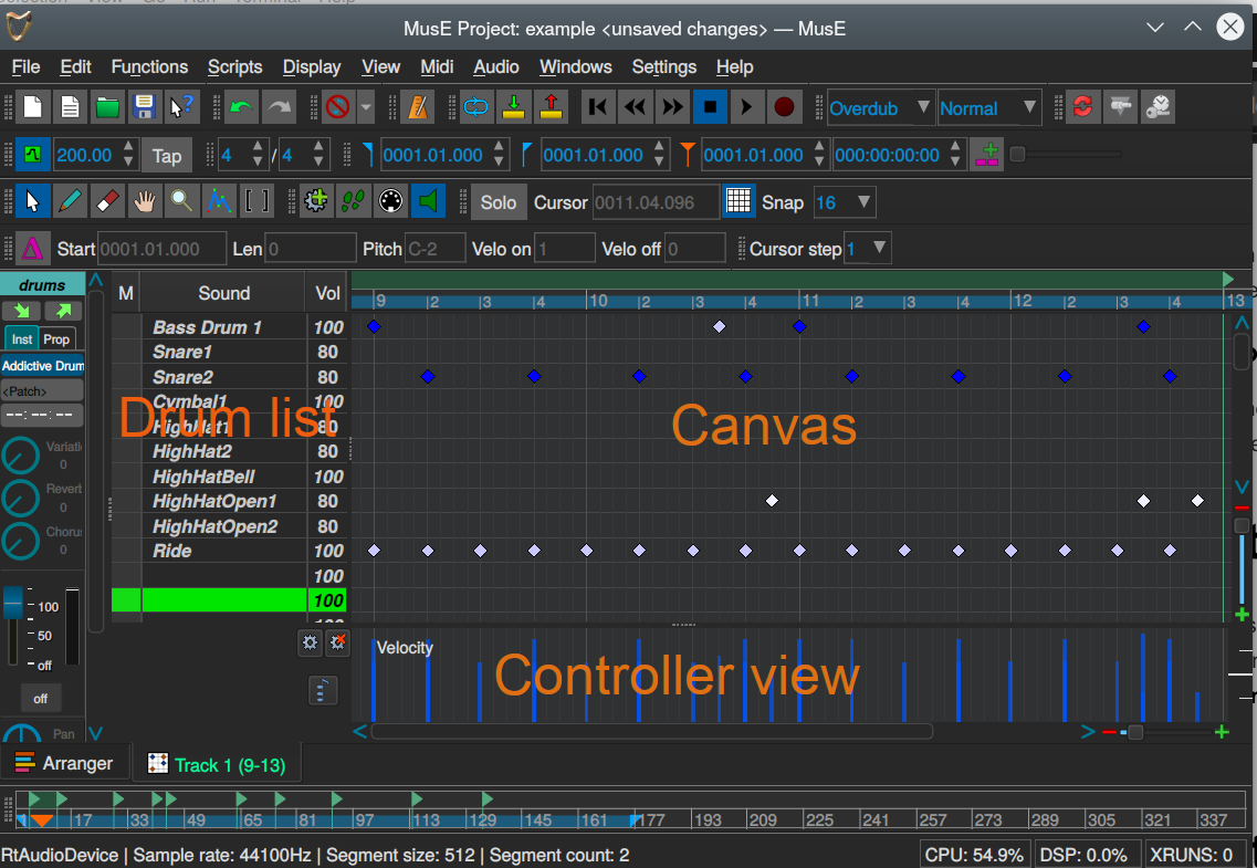 The drum editor in MusE follows the matrix editor design which is very common in MIDI editors and as the pianoroll consist of three different parts. For the drum editor they are: Drum list, Canvas and Controller view.
